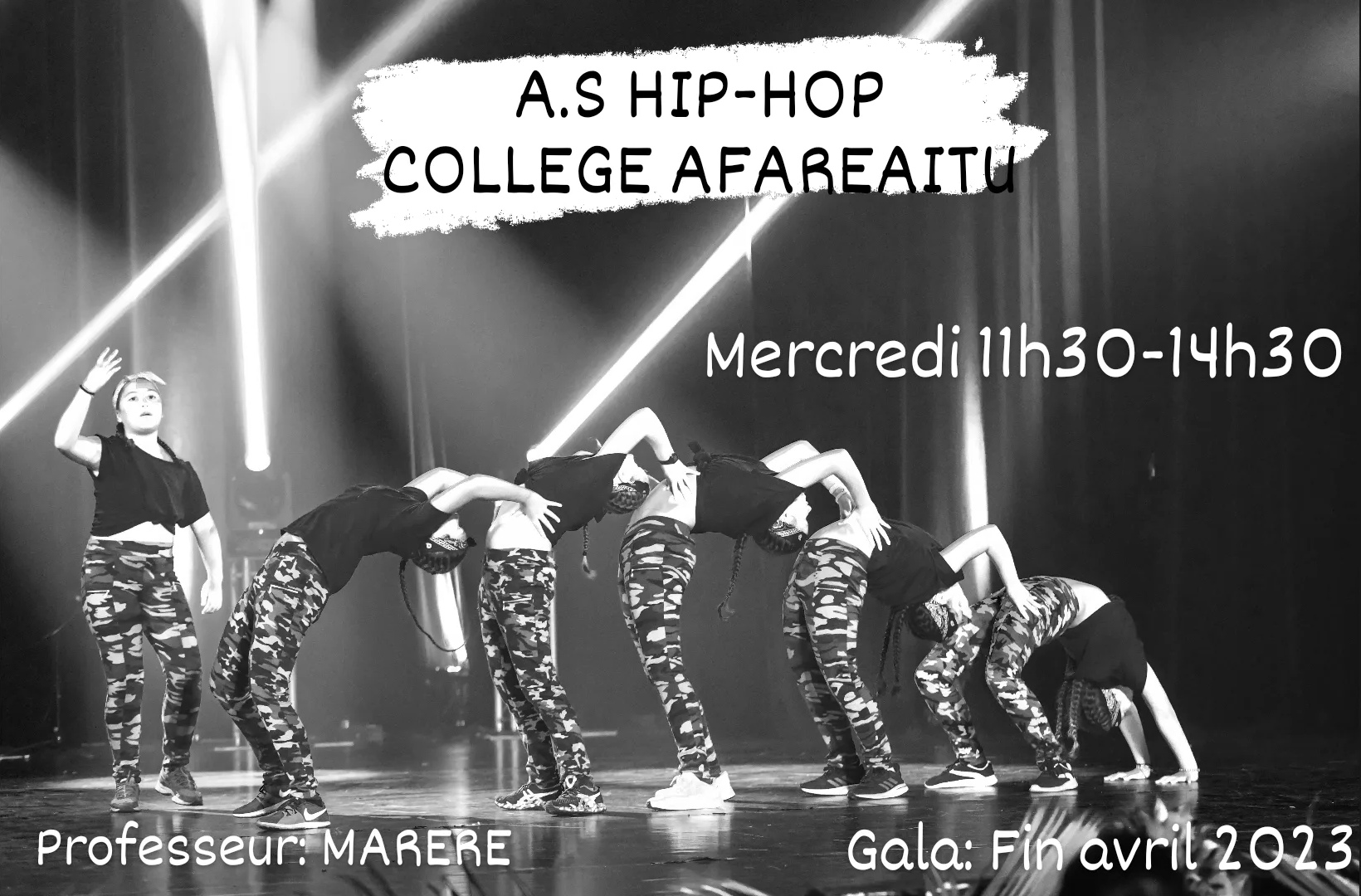 Bonjour, Le programme de notre association sportive 2022-2023 est ici : depliant présentation as 2023+ Spécial hip-hop ici : Bonne année sportive ! L’équipe AS du collège AFAREAITU : F. BONNAFIS, F. MARERE, H. HAGEL, J. GRIGAUT.